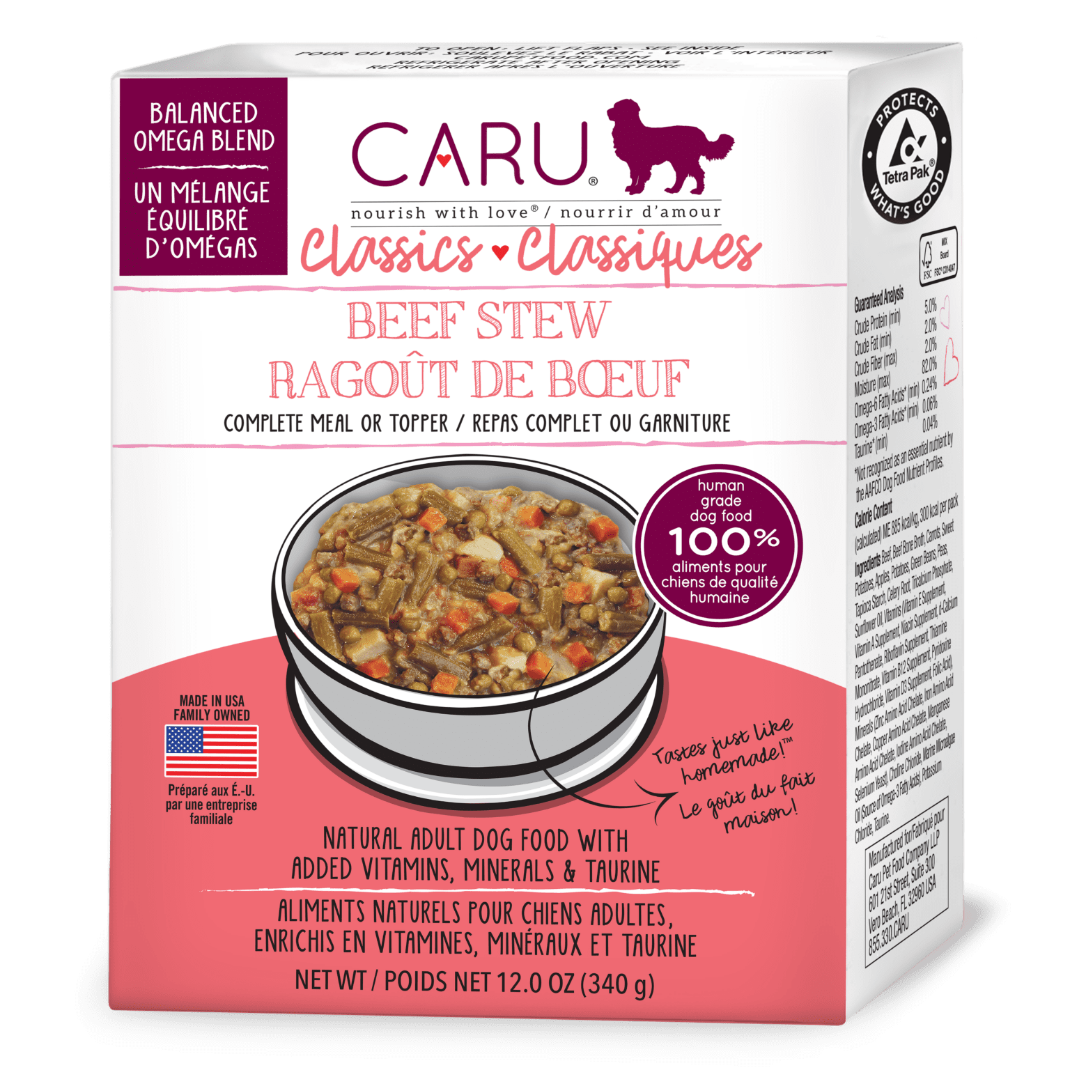 Chez Caru, nous sommes aussi passionnés que vous par la santé et le bonheur des animaux de compagnie. C’est pourquoi ce ragoût fonctionnel et sans céréales contient du bœuf inspecté par l’USDA comme premier ingrédient, et pourquoi il est fabriqué à partir d’ingrédients 100% de qualité humaine aux États-Unis. Nous avons également ajouté un mélange équilibré d’acides gras oméga pour aider votre chiot à s’épanouir à chaque bouchée. Mais voici la meilleure partie. Grâce à notre processus de cuisson et d’emballage exclusif, les ragoûts Caru Classics ont l’apparence, l’odeur et le goût du fait maison !