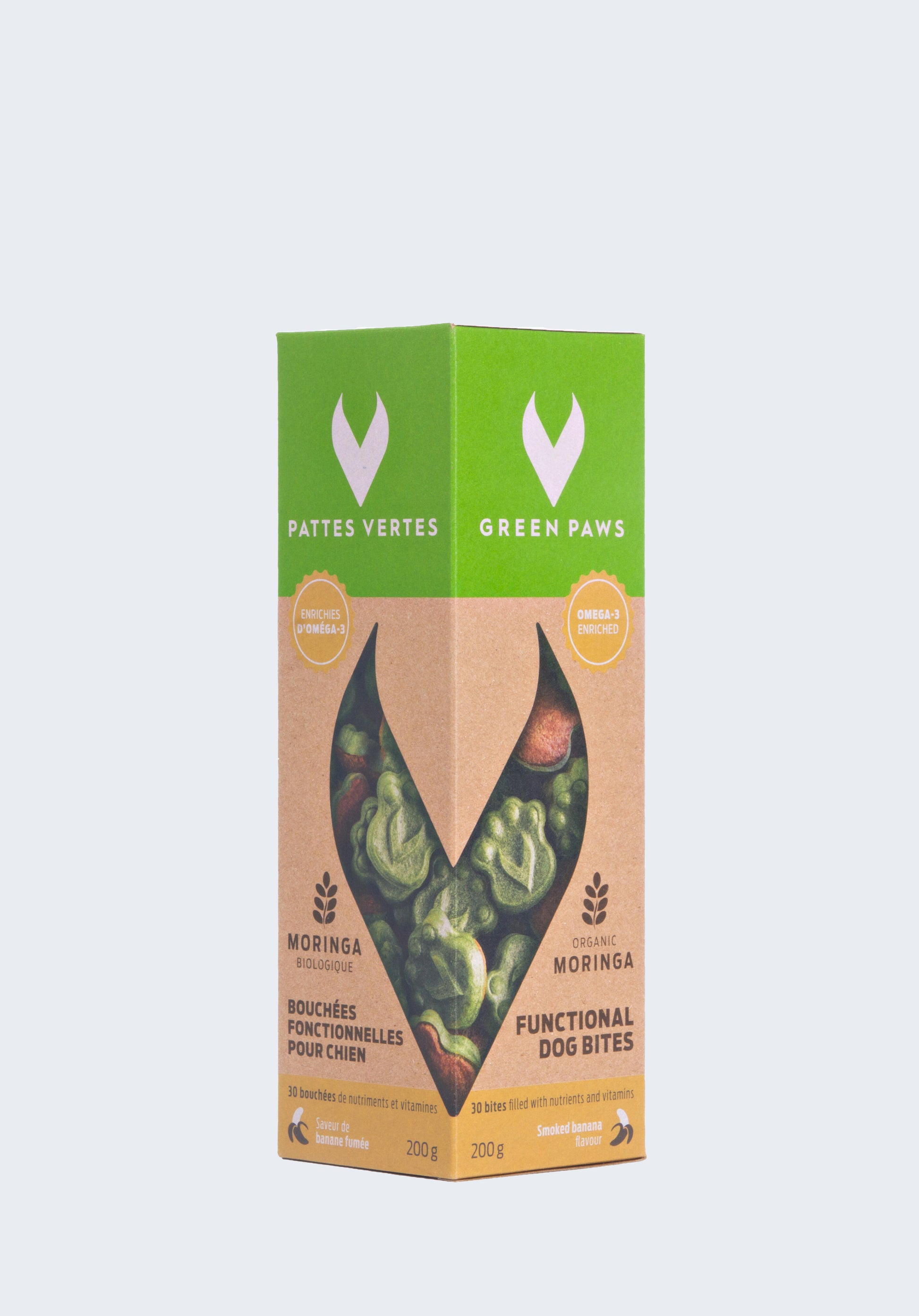 Les bouchées multifonctionnelles de Pattes Vertes, faites à base de Moringa biologique, sont des suppléments alimentaires végétariens, enrichies d’oméga-3 et écoresponsables qui complètent parfaitement l’alimentation de votre fidèle compagnon.