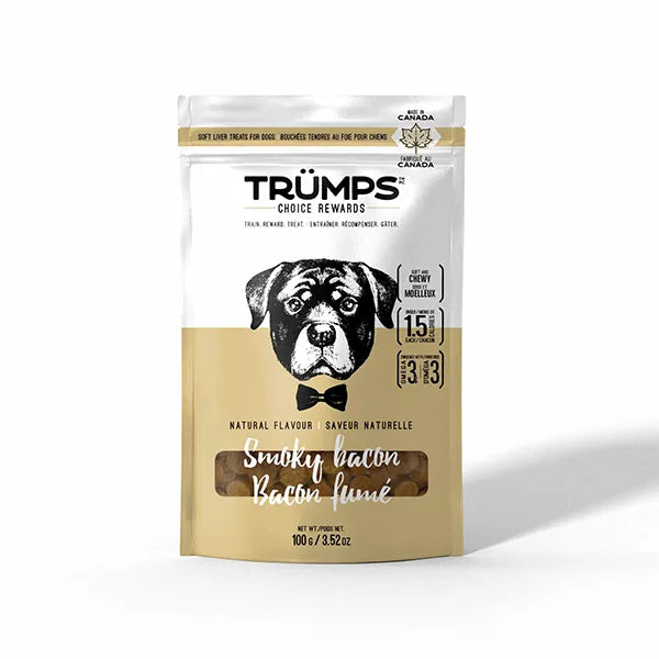 TRÜMPS Choice Rewards de Spark Pet Products est une friandise moelleuse et savoureuse pour chien qui gardera votre compagnon occupé et motivé pour le dressage. La recette au bacon fumé utilise des ingrédients d'origine canadienne comme du foie de porc, des graines de lin, un arôme naturel de bacon fumé, du riz brun, des flocons d'avoine, etc., puis est préparée à la main et cuite à la marmite en petites quantités pour une friandise de haute qualité, faible en calories et riche en oméga 3.