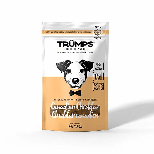 TRÜMPS Choice Rewards de Spark Pet Products est une friandise moelleuse et savoureuse pour chien qui stimulera l'intérêt de votre compagnon et l'enthousiasmera pour son dressage. Sa recette au cheddar canadien utilise des ingrédients d'origine canadienne comme du foie de porc, de l'arôme de fromage véritable, des graines de lin, du riz brun, des flocons d'avoine et bien plus encore. Elle est ensuite préparée à la main et cuite à la marmite en petites quantités pour une friandise gourmande de haute qualité, faible en calories et riche en oméga-3.